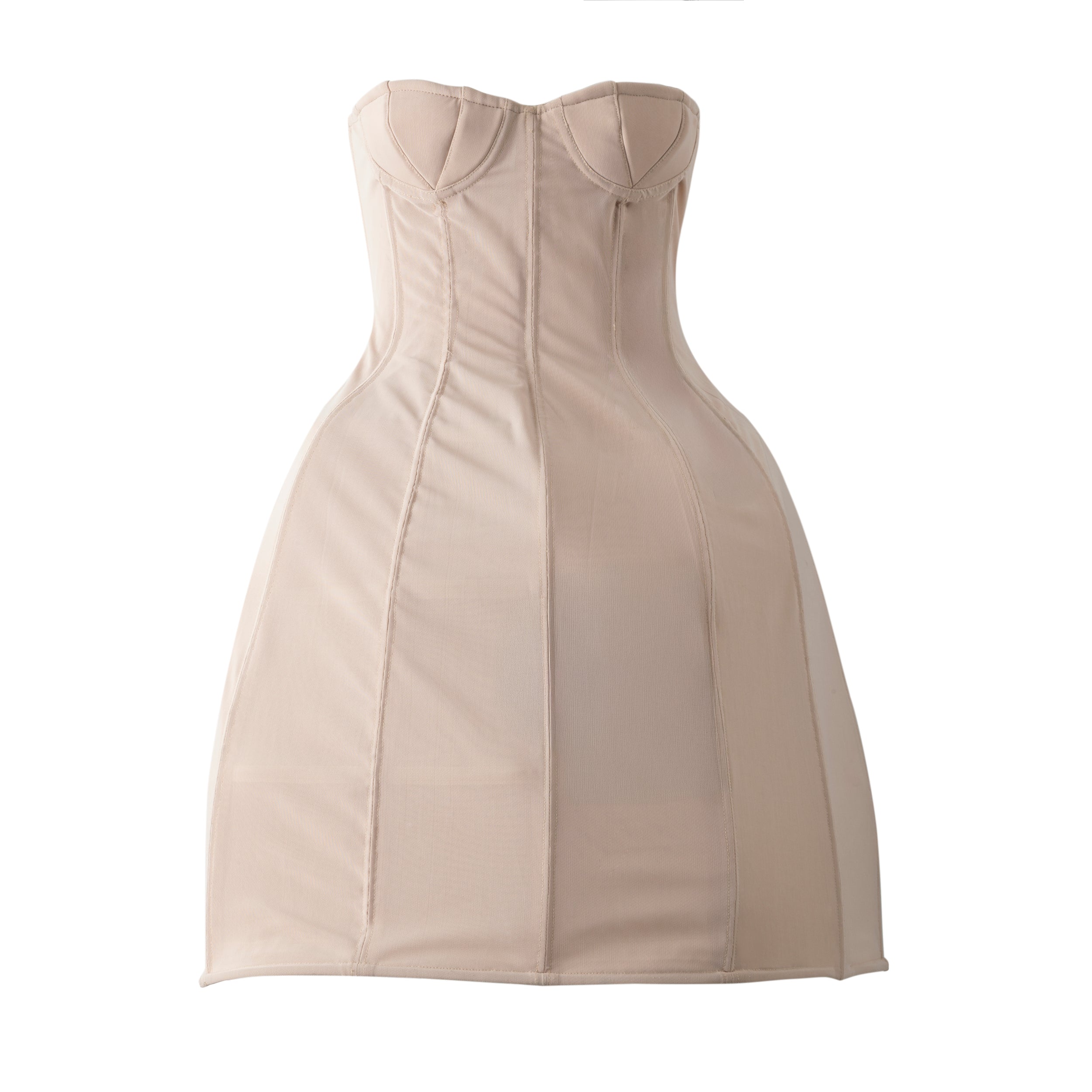 This is a really unique dress, it is made with nude stretch fabric fitted stiff supports that cinch in the waist, the boning is made of plastic, a stiff panel in the front cholds the torso rigidly upright, and eyelets in the back with some form of lacing which allows the garment to be tightened.