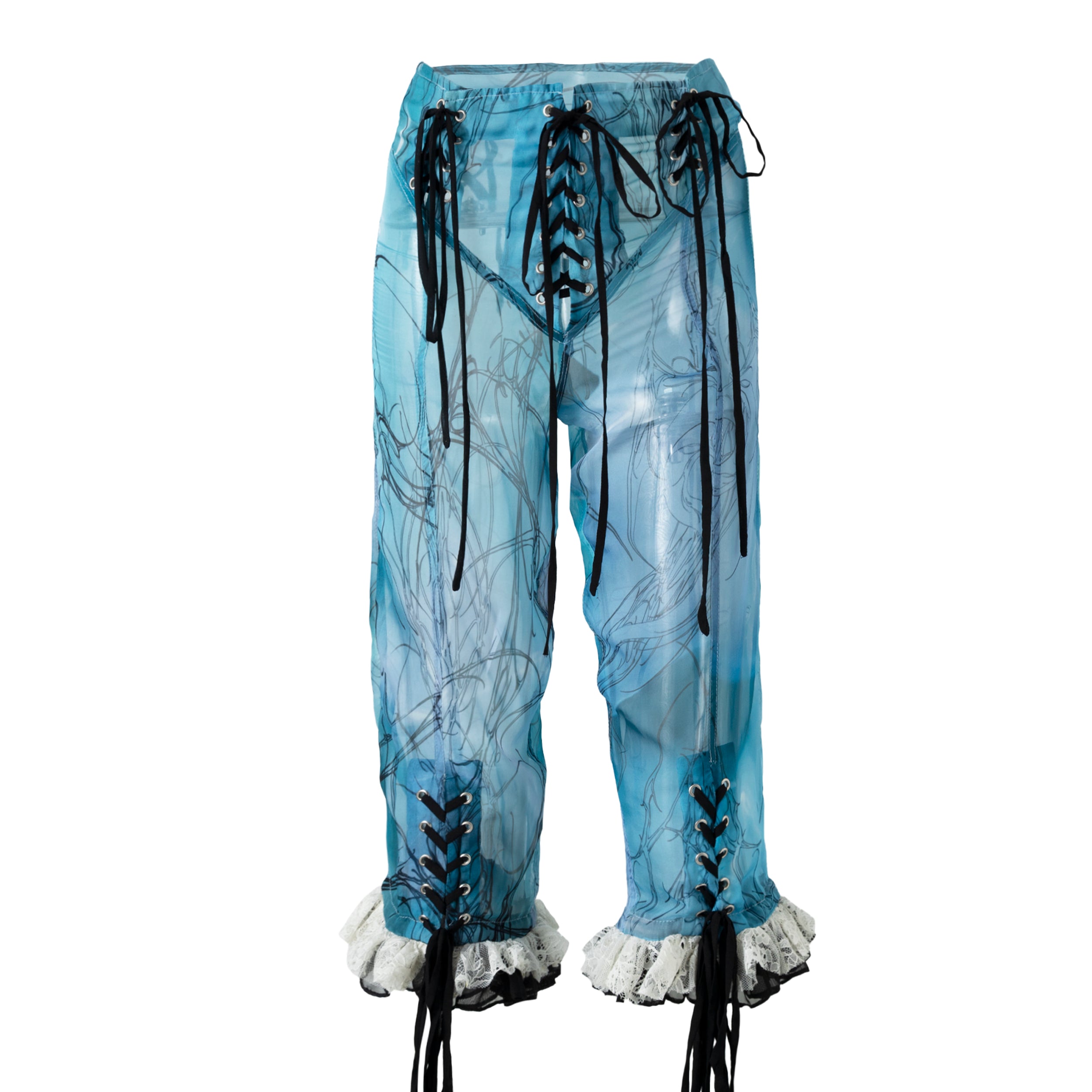 Printed chiffon pants with eyelets, adjustable on the hip, front and back. This pants have lace and chiffon draped details on the bottom.